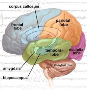 كما يلعب الفص الصدغي: الموجود على جانبي الدماغ والواقع فوق الأذن مباشرةً، دورا مهمًا في كل من السمع واللغة والذاكرة، وقد وجد أن بعض أجزائه تولد إشارات البدء في نوبة الصرع، حيث يمكن إزالتها دون فقدان القدرات العقلية الأساسية.