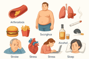- قلة النشاط البدني: يؤدي إلى زيادة الوزن، وارتفاع ضغط الدم، وانخفاض الكوليسترول الجيد.
